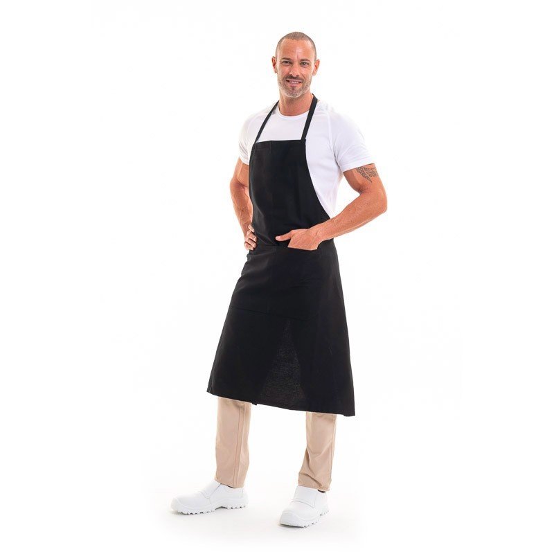 Tablier à bavette noir offrant une protection optimale en cuisine ou en service.
